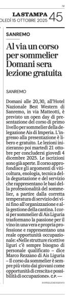 Al via giovedì 16 ottobre 2025 a Sanremo il corso per diventare sommelier di Ais Liguria